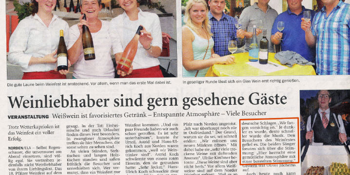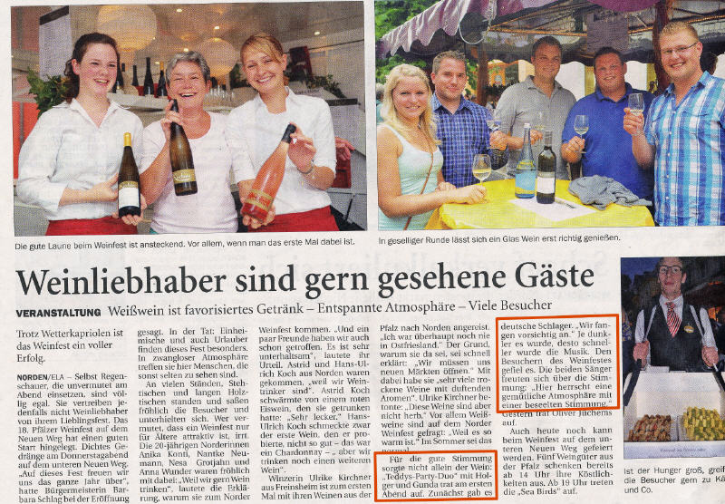 Der Donnerstagabend vor dem letzten Wochendende im Juli ist bei uns zu einem seit Jahren immer wieder gern gespielten Termin geworden: Ab 19.00 Uhr ist das Partyduo auf dem Weinfest in Norden zu sehen und zu hören. Es war dieses Mal, zumindest an diesem Abend, noch besser besucht als in den Vorjahren und die Stimmung war prächtig - trotz des ab 22.30 Uhr einsetzenden Regens hat sich kaum ein Gast auf den Heimweg gemacht, es wurde einfach im Regen gefeiert und mit Einbruch der Dunkelheit auf der Straße getanzt. Wir bedanken uns für die vielen positiven Reaktionen und Anfragen und das Interesse an unserer Musik.Wir kommen im nächsen Jahr gerne wieder und zwar am 24.07.2014 ab 19.00 Uhr.